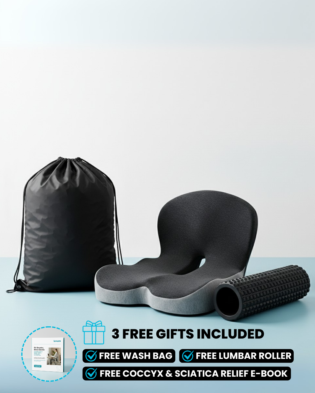 Typical seat cushions compress, slide, and keep pressure on the coccyx, so the ache returns. Ergonomic chairs may help posture but still load the tailbone and can't follow you wherever you sit.